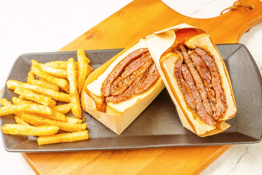 別以為這只是個肉多的三明治而已,連吐司麵包也有戲!烤得外酥內軟、帶點焦香的金黃吐司,緊緊夾住厚切牛排,一手拿起來沉甸甸的,根本就是「重量級選手」!從側面看,斷層分明的牛排肉層讓人忍不住想拍十張再吃,不管是肉控、麵包控還是拍照控,通通無法抗拒。