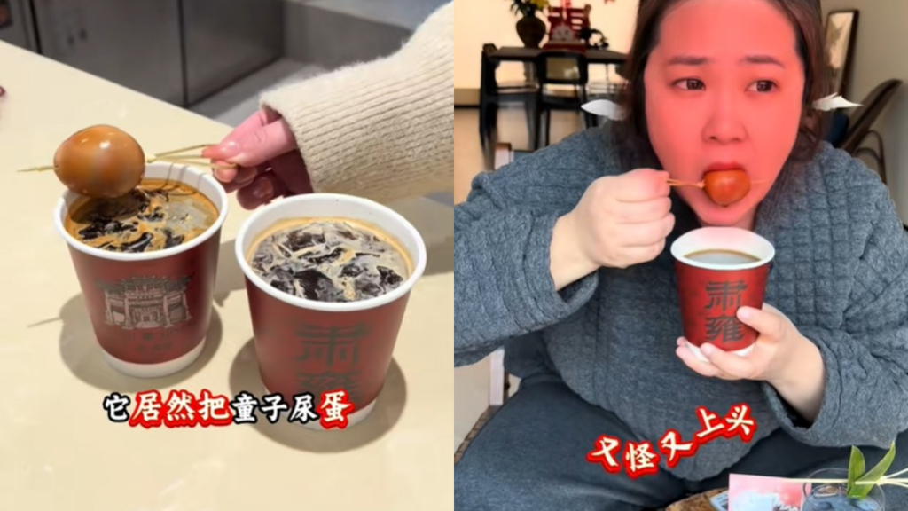 綜合媒體報導,浙江省東陽市的燊肅雍咖啡館,近日結合特色小吃童子尿蛋,推出全新口味咖啡,當地美食部落客雖然以「黑暗料理」來稱呼這杯咖啡,但卻在鏡頭前一口童子尿蛋、一口咖啡狂嗑,大讚「咖啡微苦回甘、雞蛋鹹香,一口下去又怪又上頭」。